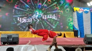 காஞ்சிபுரம் புத்தகத் திருவிழாவில் புதிய புயல் நடன குழுவினரின் கலை நிகழ்ச்சி அனைவரையும் கவரும் வண்ணம் இருந்தது.