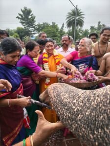 மணிமண்டபத்தின் முன்பாக நின்றிருந்த தர்மபுரம் ஆதீனத்தின் யானைக்கு பழங்கள் கொடுத்து யானையிடம் ஆசீர்வாதம் பெற்றார்.