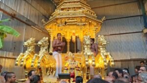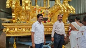 இதன் தொடர்ச்சியாக தங்கத்தேர் செய்த சிற்பிகளுக்கு சால்வை அணிவித்து கௌரவித்தார்.