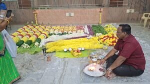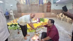 இதில் மாலைகள் வரிசையாக அடுக்கி வைக்கப்பட்டிருந்த அலங்கார மாலைகளுக்கு தீபாராதனைகளும் காண்பித்தார்.