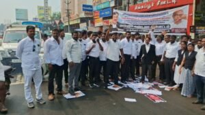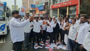 வழக்கறிஞர் தாடிகார்த்தி தலைமையில் நடைபெற்ற இந்த ஆர்ப்பாட்டத்தின் போது ராகேஷ் கிஷோரின் புகைப்படங்களை செருப்பு கொண்டு அடித்தும், காலால் மிதித்தும் கண்டன கோஷங்களை எழுப்பி தங்களது கண்டனங்களை வழக்கறிஞர்கள் பதிவு செய்தனர்.