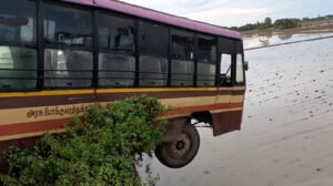 பொன்னேரி அருகே அந்தரத்தில் தொங்கிய அரசு பேருந்து – பயணிகள் பொதுமக்கள் அதிர்ச்சி!