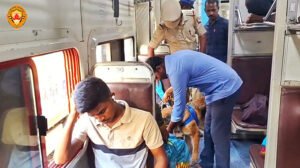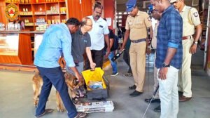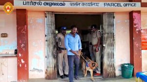 ரயில் நிலைய நுழைவாயில் மற்றும் ரயிலை அமர்ந்திருந்த பயணிகளின் உடமைகளை தமிழ்நாடு காவல்துறை வெடிகுண்டு நிபுணர்கள் சிறப்பு உதவி ஆய்வாளர்கள் சிவசக்திவேல், சரவணன் ஆகியோர் கொண்ட குழுவினர் மோப்ப நாய் மற்றும் வெடிகுண்டு சோதனை செய்யும் கருவியின் உதவியுடன் பயணிகளின் உடைமைகளை சோதனை செய்தனர்.